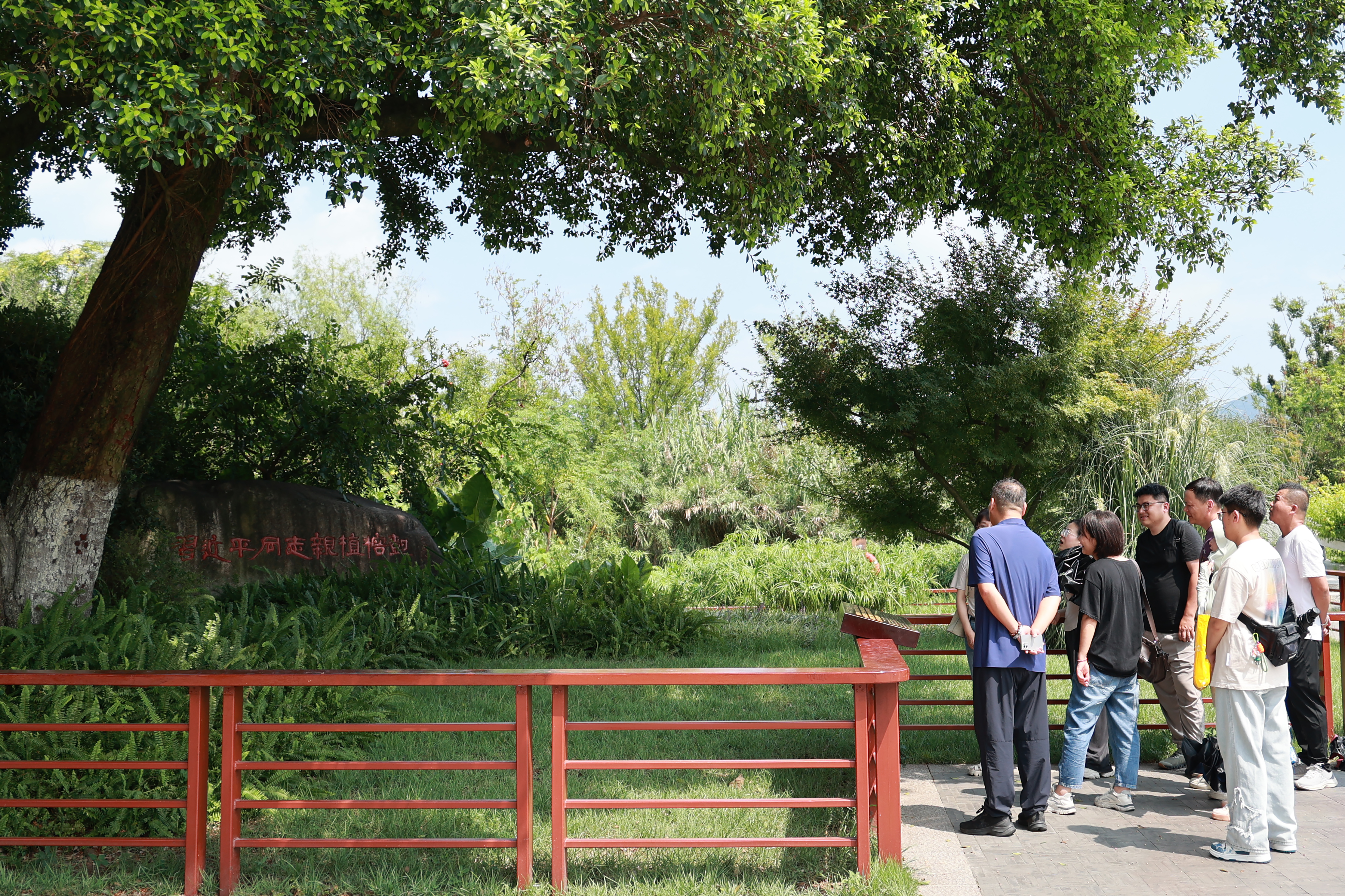 黨員們首先來(lái)到三垟濕地北出口公園“循跡溯源學(xué)思想促踐行”示范點(diǎn)——“習近平總書(shū)記親植榕樹(shù)”處參觀(guān)學(xué)習。這是2005年5月20日時(shí)任浙江省委書(shū)記習近平同志考察三垟濕地時(shí)親手種植的。大家在樹(shù)前學(xué)習了習近平總書(shū)記“一定要把溫州生態(tài)園保護好、利用好、建設好,辦成對子孫后代積德的一件善事,辦成造福于當地群眾的一件實(shí)事,辦成生態(tài)建設的一件好事”的重要講話(huà)。沿著(zhù)習近平總書(shū)記的足跡,大家深刻領(lǐng)悟習近平新時(shí)代中國特色社會(huì )主義思想在浙江萌發(fā)和實(shí)踐的歷程,深刻感受“八八戰略”實(shí)施以來(lái)溫州大地的精彩蝶變。